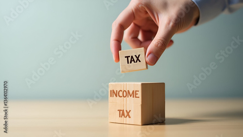 Flat Hand Placing Tax Icon into Wooden Cube: A Cute Vector Illustration Symbolizing Income Tax Return Submission and Online Tax Payment to Government for Smart Business Solutions