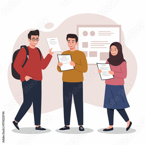 Flat Illustration Three Students Discussing Assignment in Campus Scene