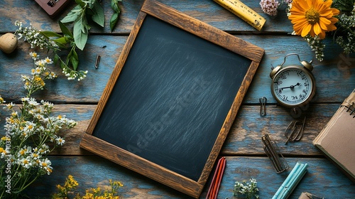 Flat lay composition featuring a blank blackboard at the center surrounded by colorful stationery supplies a vintage alarm clock and a charming flower arrangement on a textured wooden surface