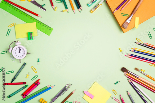 Flat lay frame composition from school supplies on a green background. The concept of the teacher's day.