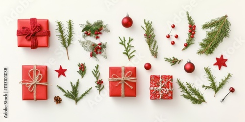 Flat lay of neatly wrapped red gifts, green fir branches, and red ornaments on a white background, exuding festive Christmas charm.