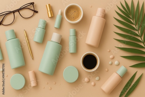 Flat Lay of Stylish Skincare and Office Essentials on Beige Background