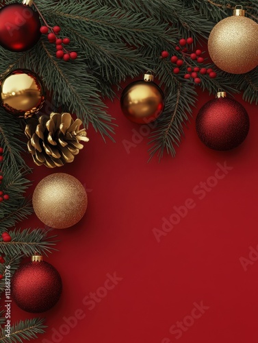flat lay with pine tree branches with red and golden christmas balls isolated on red