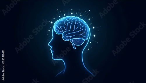 Flat Low Poly Brain: Abstract Vector Illustration of Wisdom with Polygonal Wireframe Design in Blue on Dark Background - A Smart Business Concept with Lines and Dots