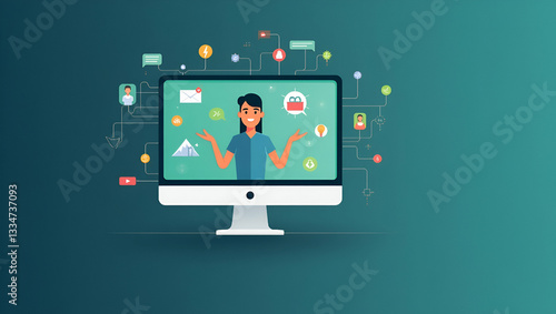 Flat Person presents CSR icons on digital interface representing corporate social responsibility sustainability ethics community and environmental concerns in business. concept as Person presents CSR