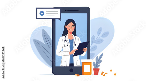 Flat style illustration of a female doctor offering online consultation via smartphone with medical icons and plants