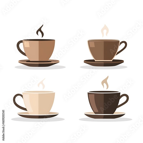Flat vector icon pack of four coffee cups in varying brown tones, each with unique shapes and handles, steam icons rising, clean 2x2 layout on a