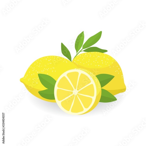 Flat vector illustration of half and two fresh whole lemons decorated with leaves.