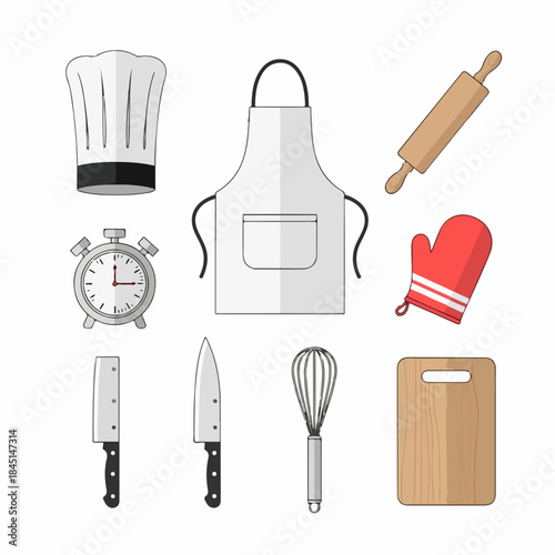 Flat vector illustration set of essential cooking and baking tools: chef hat, apron, knives, rolling pin, whisk, timer, and cutting board icons.