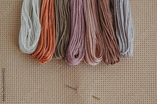 flatlay creativity: canva aida beige and multi-colored thread mouline thread, cross-stitch 1