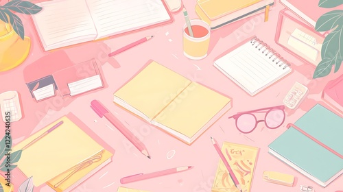 Flatlay pastel desk, books, stationery, plants; study, work background