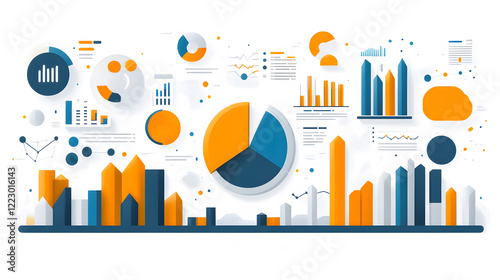 Flat-style illustration of business data analytics featuring pie charts, line graphs, and blank white space for text