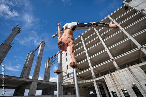 Flexible male circus Artist keep balance on one hand against amazing cloudscape and modern constructions . Individuality, creativity and modern point of view concept