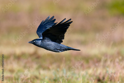 Fliegende Dohle im Herbst in Schweden