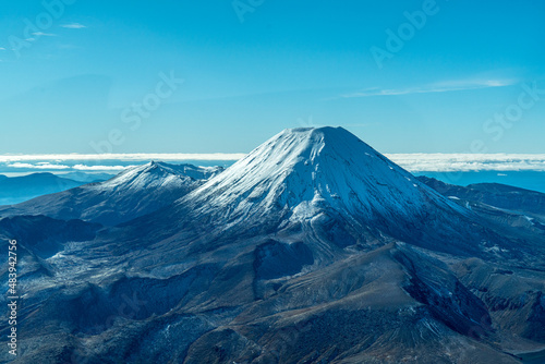 Flight around the snow covered Mount Ngauruhoe in Tongariro National Park - New Zealand.