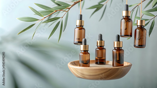 Floating Bamboo Leaves and Essential Oil Bottles for Aromatherapy Wellness Spa