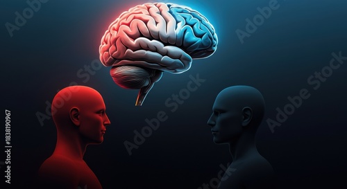 Floating brain between two human heads in contrasting red and blue lighting