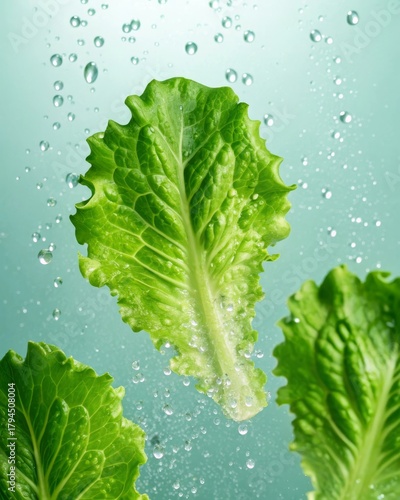 Floating fresh green lettuce leaves with water droplets in a vibrant commercial product setting captured in a bright and refreshing environment