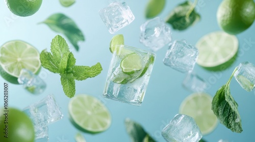 Floating mojito ingredients with lime, mint, and ice on a bright, refreshing background