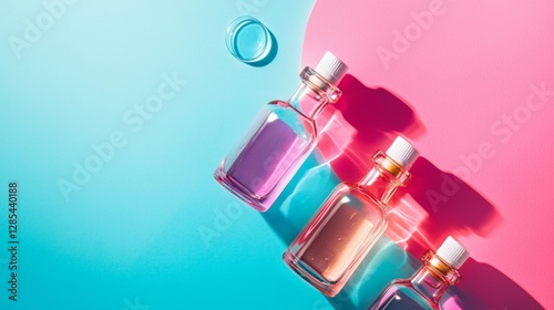 Floating perfume bottles in blue and pink light