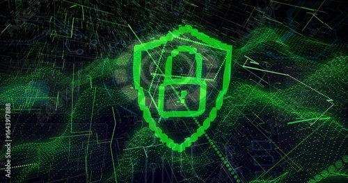 Floating pixelated green shield rotating above virtual grid, with padlock icon and data points
