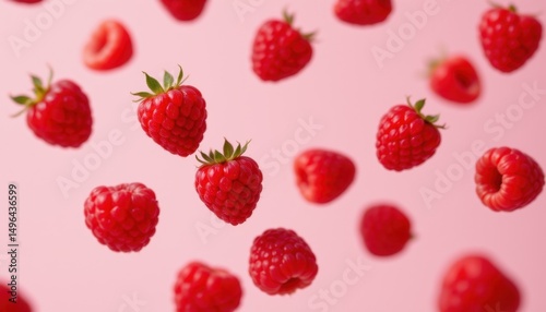 Floating raspberries in bright pink background fruit photography studio environment close-up delicious concept