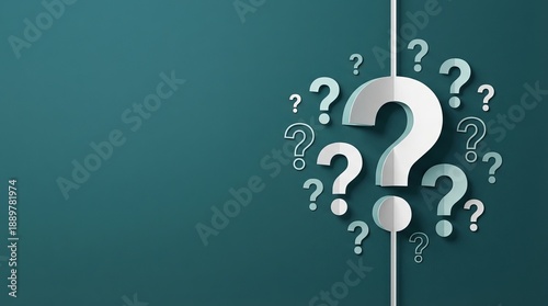 Floating white question marks on a teal surface represent inquiry and symbolize the concept of asking questions in studio lighting.