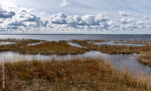 flooded lake shore, overgrown with last year's reeds and bushes, bird migration, beautiful cumulus clouds