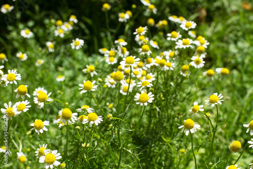 Flor de manzanilla en el campo. Vista de frente y de cerca