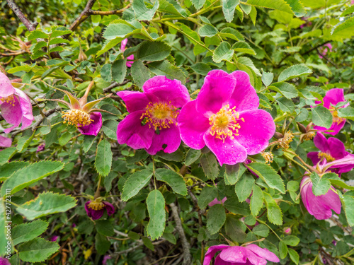Flor silvestre conocida como Rosa Brillante (Rosa nitida) en el entorno del Lago de San Mauricio, en el Parque Nacional de Aigües Tortes, situado en los Pirineos españoles