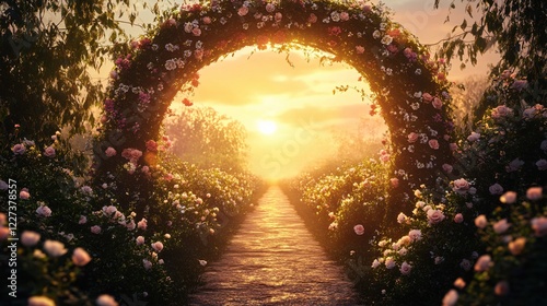 Floral archway at sunset leading to a path through a garden with soft light and warm tones