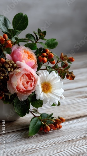 Floral Arrangement with Roses, Daisy, Berries on Rustic Wood Surface