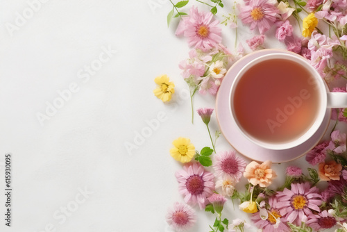 Floral banner and cup of tasty tea. AI generative