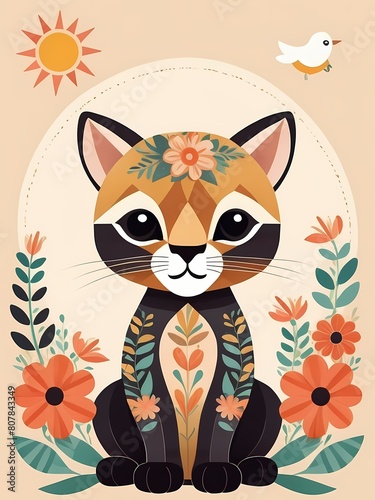 Floral Cute Baby Puma Nursery Generative AI Illustration