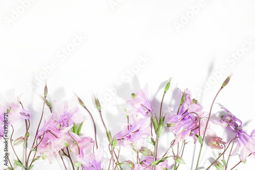 Floral delicate background for text or product, top view. Pink Aquilegia flowers on a white background with hard shadows. Border.