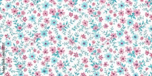 Floral Sketch Pattern - Blue and Pink Flowers, White Background, Seamless Repeat, Vintage, Floral Pattern, Textile Design , floral