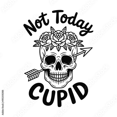Floral skull design with text not today cupid in black and white