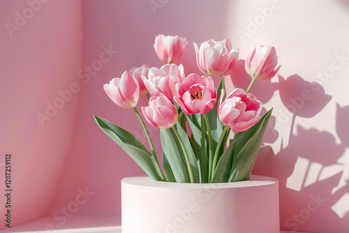 Flower display with pink tulips and blossoms, springtime or woman day concept