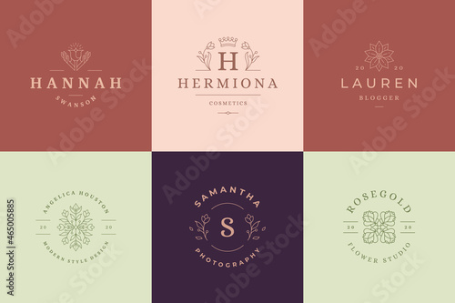 Flower logos emblems design templates set with botanical plants and rose vector illustrations minimal linear style.