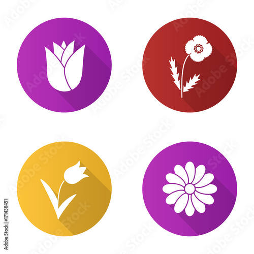 Flowers flat design long shadow glyph icons set