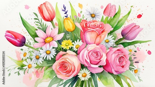 Flowers for International Women’s Day, watercolor illustration of a vibrant bouquet featuring roses, tulips, and daisies, surrounded by soft pink and green splashes