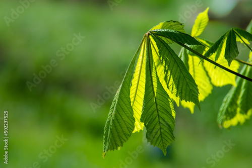 Flowers of a Chestnut Tree Twig, Fresh Green Leaves in Early Spring, selective focus, Aesculus hippocastanum spring blossom of white horse-chestnut tree. blue sky, copy space