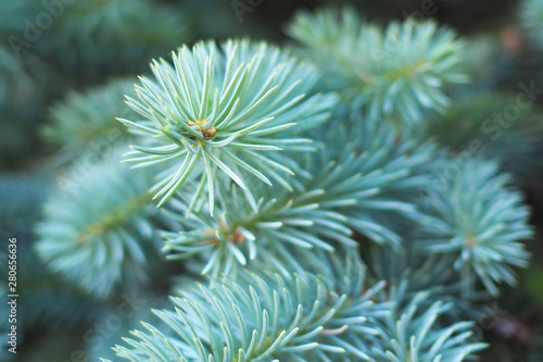 Fluffy green pine branch close-up.
