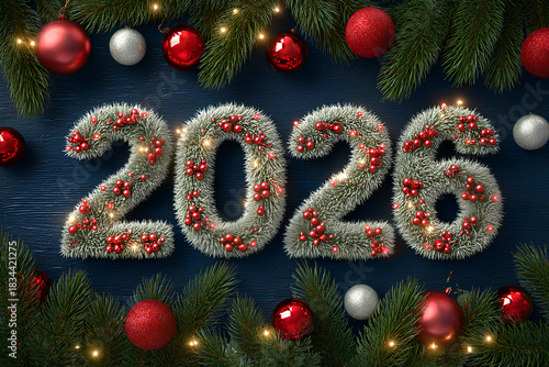 Fluffy Pine Needle Digits 2026 with Ornaments and Lights – New Year Illustration