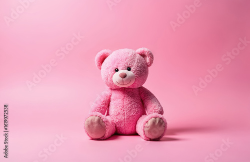 Fluffy pink teddy bear sitting on solid pink background. Soft plush toy perfect gift for Valentine Day occasion celebrating love, childhood. Cute, cuddly appearance, classic stuffed animal design