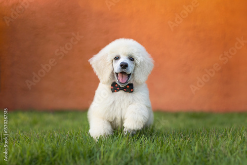 Fluffy Poodle Pup in Bowtie Running on Grass