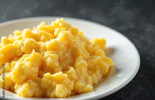 Fluffy scrambled eggs piled high on a clean white plate. This simple, rustic dish is perfect for breakfast or a quick meal. Deliciously soft eggs served hot, ready to eat.