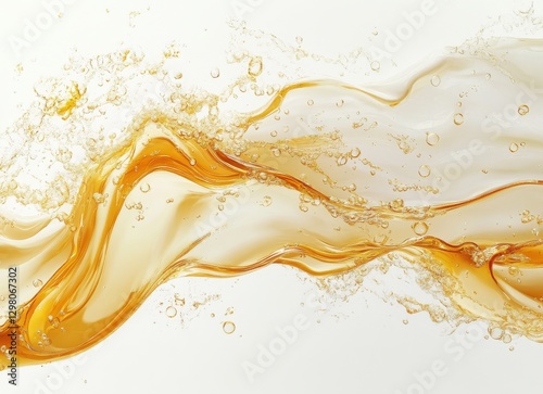 Fluid motion of golden liquid with bubbles and waves captured on a white background in a high-definition quality image for creative projects and designs.