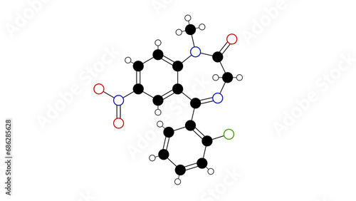 flunitrazepam molecule, structural chemical formula, ball-and-stick model, isolated image benzodiazepine