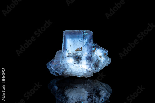 Fluorite with phantoms under Short wave ultraviolet. UV photography isolated on black background. macro detail close-up rough raw unpolished